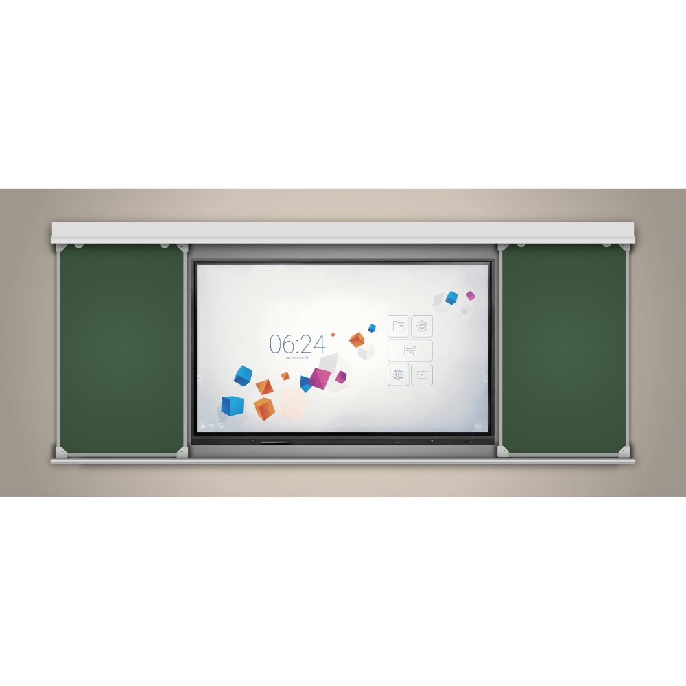 Многофункциональная раздвижная система аудиторных досок. Система состоит из четырёх аудиторных досок с различными поверхностями (формат экрана 75 дюймов).