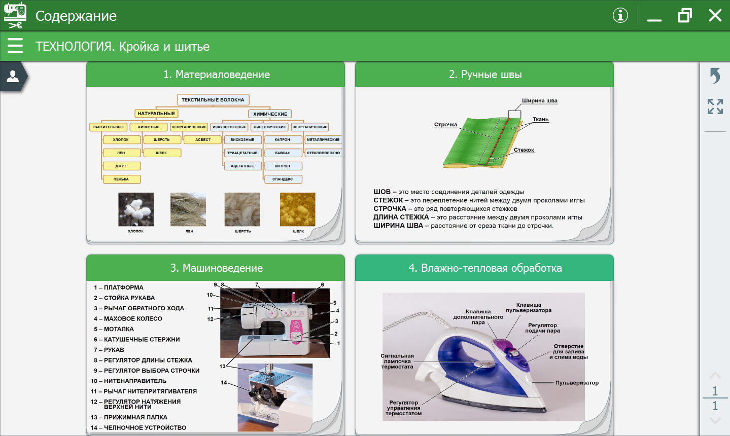 Отличительной особенностью интерактивных учебных пособий ТЕХНОЛОГИЯ. Кройка и шитье» является создание собственной тематической последовательности курса с возможностью включить дополнительные медиаобъекты в структуру самого пособия.