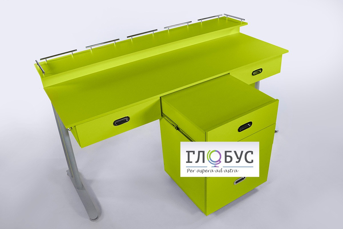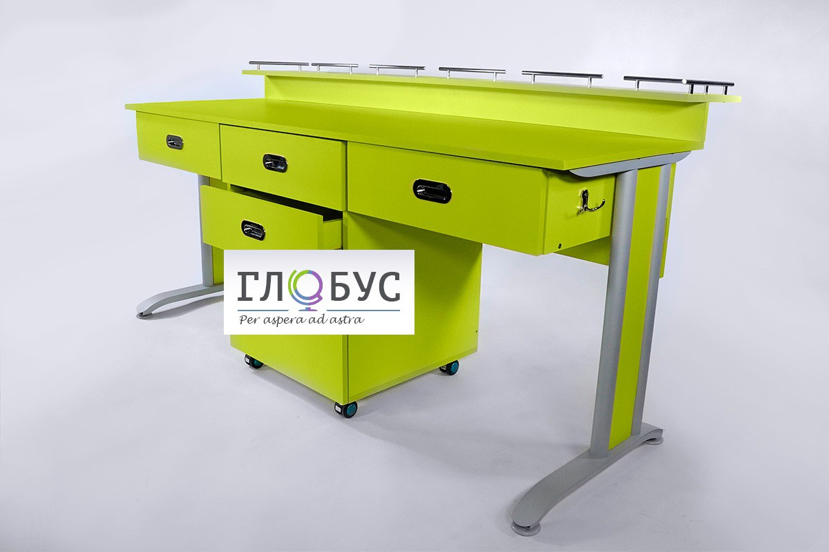 Столешница изготовлена из высококачественного ЛДСП с пластиковым покрытием. Периметр столешницы закрыт стойкой каймой из ПВХ, по бокам стола, на металлических каркасах установлены крючки для портфелей и сумок. Имеется выдвижная тумба для  установки лабораторного оборудования, 5 выдвижных ящиков.Стол предназначен для занятий учащихся на уроках химии, физики, биологии, естествознанию в средней школе. Каркас стола выполнен из комбинированной трубы с порошковой окраской, имеет боковые вставки из ЛДСП.