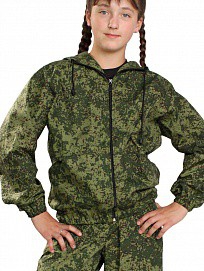 Костюм состоит из куртки и брюк. Куртка укороченная с капюшоном, центральной застежкой на тесьму-молнию, рукав втачной по низу стянут эластичной тесьмой. Низ куртки стянут на эластичную тесьму. Брюки прямые на поясе стянуты эластичной тесьмой. Выполнен из облегченной х/б ткани, упакован в компактную сумочку из аналогичной ткани.