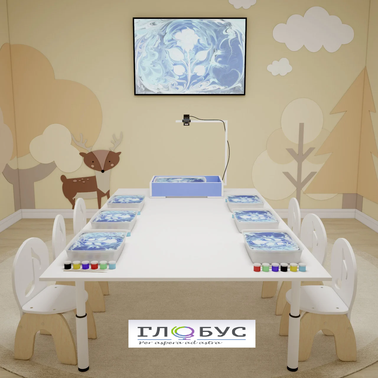 • 1. Стол учителя для демонстрации работы - "Водная Фантазия!" с яркой подсветкой, большим поддоном для рисунка формата А3, удобной крышкой и ножками (710 мм);