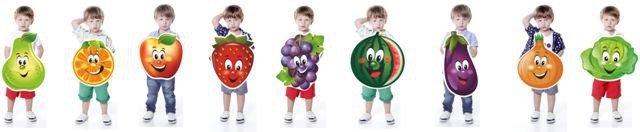 В данном наборе 9 костюмов с изображением фруктов, овощей и ягод.