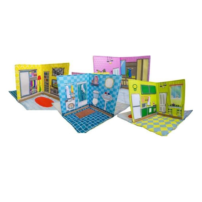 Разделена на 4 зоны: прихожая, кухня, комната, ванная. Все это дополнено навесными элементами (мебель: стол, диван, кресло, яблоко, мороженое, конфета, шляпа, шампунь, кукла и одежда: юбка, боди, куртка, карточка к телевизору) для более интересной игры.