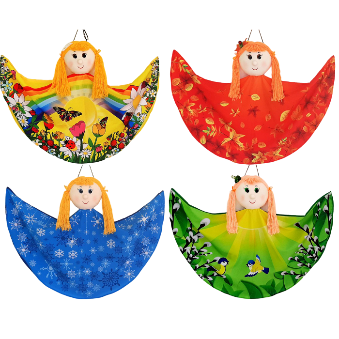 В набор входят платковые куклы по временам года: зима, весна, лето и осень.