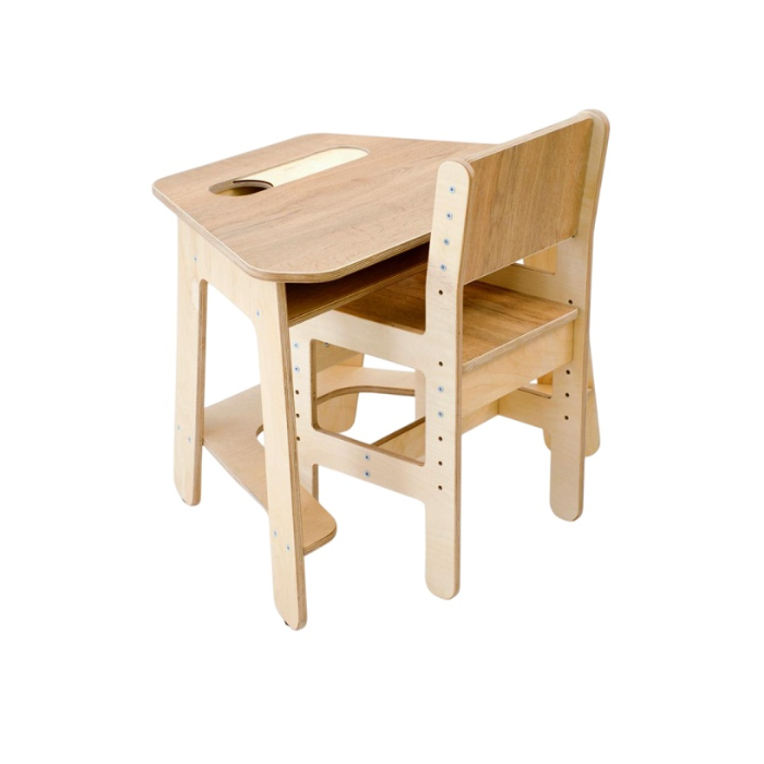 - «Детский стол» имеет форму трапеции. Необычный дизайн столешницы даёт возможность экспериментировать с расстановкой парт и позволяет максимально эффективно заполнять пространство в классе. Парты легко собираются в круг, линию или змейку, давая детям возможность взаимодействовать друг с другом. В столешнице предусмотрено отверстие под стаканчик с канцелярскими принадлежностями и полка для хранения мелочей, а снизу конструкции – опора для ног.