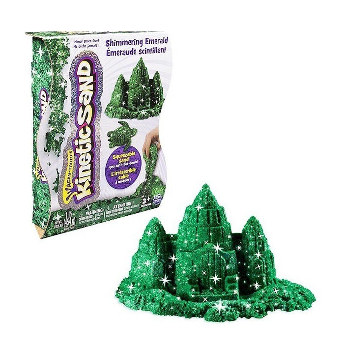 Кинетический песок цвета "Изумруд" из коллекции «Драгоценные цвета» упакован в яркие подарочные коробки весом по 455г. Им можно играть самостоятельно, а можно сочетать с другими цветами кинетического песка.
