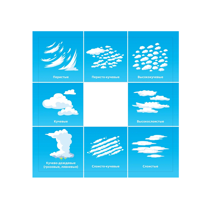 Планшет двусторонний. С одной стороны планшета вокруг центрального окошка размещены изображения различных видов облаков с названиями, на другой стороне – изображения погодных явлений.