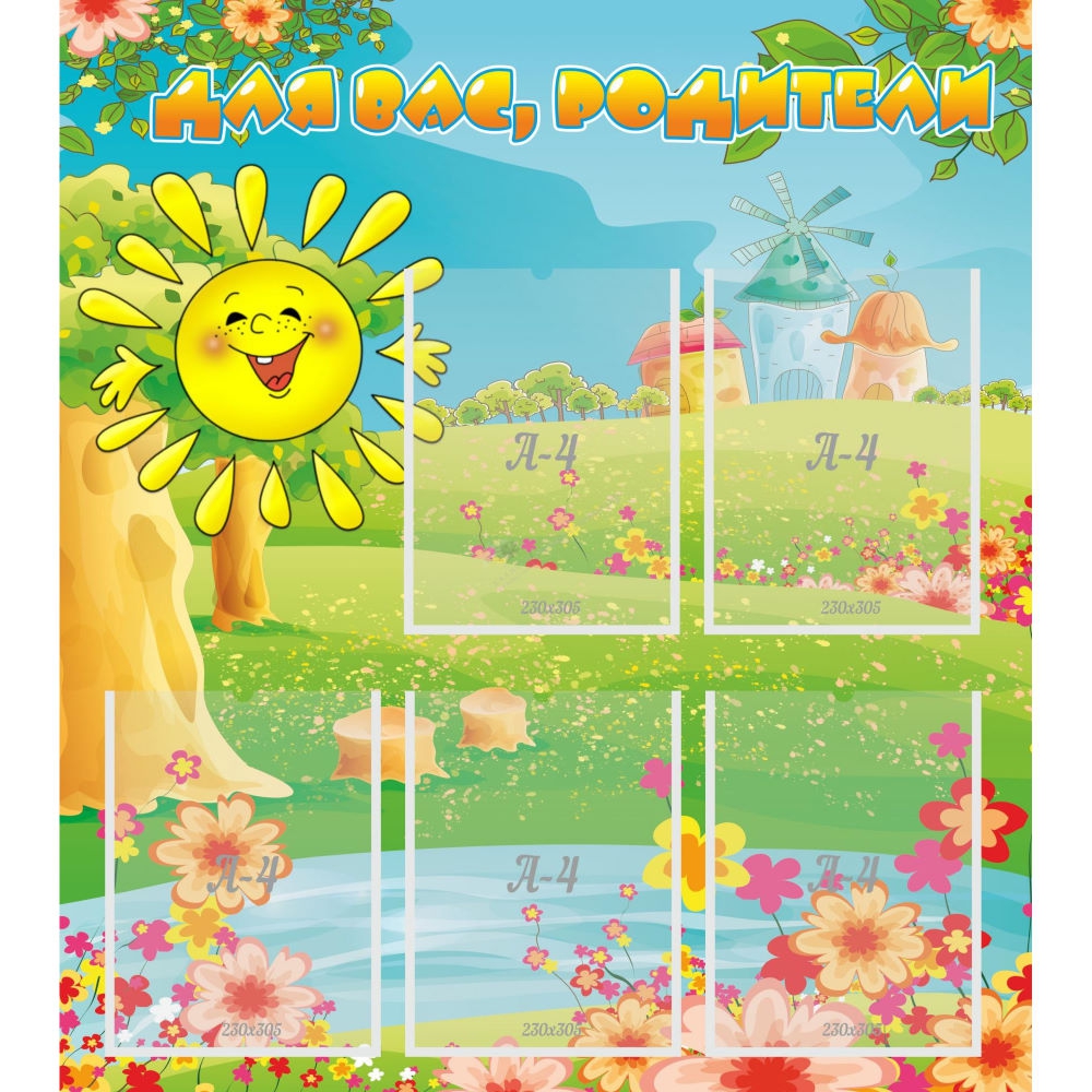 Нарядный стенд для размещения информации о малышах, их достижениях, планах и будущих мероприятиях, которая адресована родителям. Яркое оформление в розово-желтых цветах привлекает внимание, а лучистое улыбчивое солнышко рассеет даже самое хмурое настроение. Карманы облегчают размещение информации.
