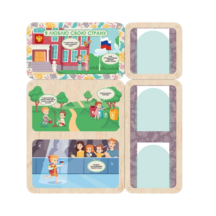 Информационный стенд для оформления стен в детских садах, начальной школе и организациях дополнительного образования. Красочные наглядные иллюстрации с простыми подписями помогут воспитать дошколятам правильные устои и ценности уважения к своей Родине, даже если они ещё не умеют читать. Важная информация для родителей может размещаться в акриловых карманах около каждого стенда.