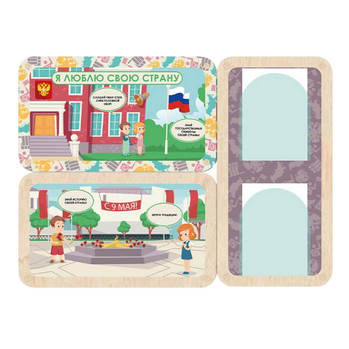 Информационный стенд для оформления стен в детских садах, начальной школе и организациях дополнительного образования. Красочные наглядные иллюстрации с простыми подписями помогут воспитать дошколятам правильные устои и ценности уважения к своей Родине, даже если они ещё не умеют читать. Важная информация для родителей может размещаться в акриловых карманах около каждого стенда.