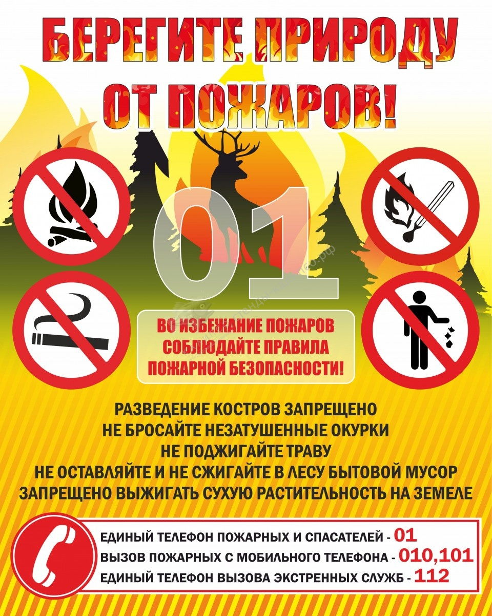Стенд "Берегите природу" выполнен в виде плаката, призывающего сохранять природу от лесных пожаров. На оранжево-красном фоне размещены основные правила пожарной безопасности при нахождении в природных условиях и номера телефонов экстренных служб.