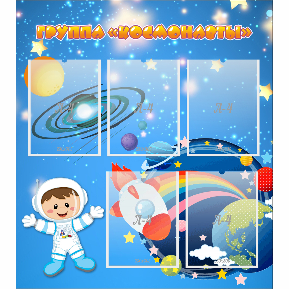Дизайн стенда разработан по космическим мотивам. Название стенда нарисовано яркими буквами необычной формы. В пяти прозрачных карманах можно поместить информацию о сетке занятий для детей, ежедневном меню, планируемых мероприятиях, контактных телефонах воспитателей. Такой стенд будет хорошо выглядеть в раздевалке или на стене у входа в группу.