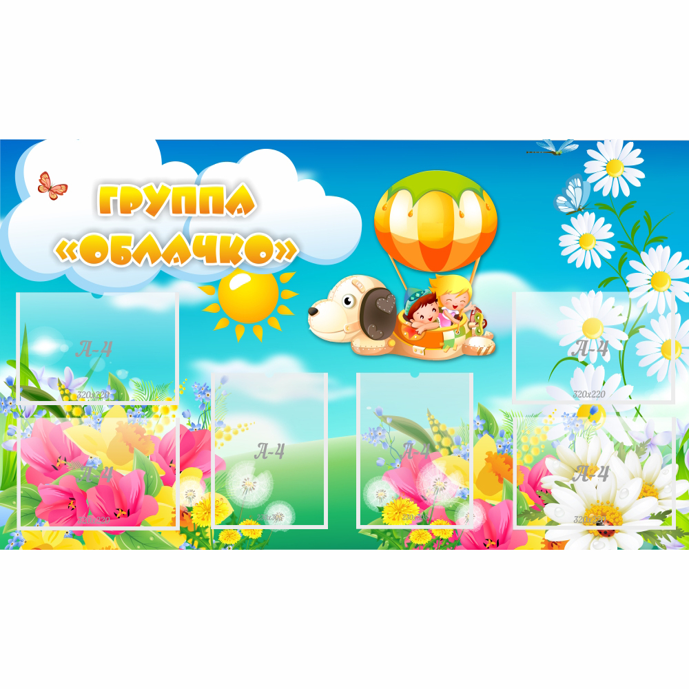 Летят по облачному небу над цветущими лугами ребята на фантастическом воздушном шаре. Горит на облаках выполненное с использованием желто-оранжевого градиента название стенда. А в шести его прозрачных карманах формата А4 размещается разнообразная информация для родителей: о правилах посещения группы, режиме, сетке занятий и многом другом.