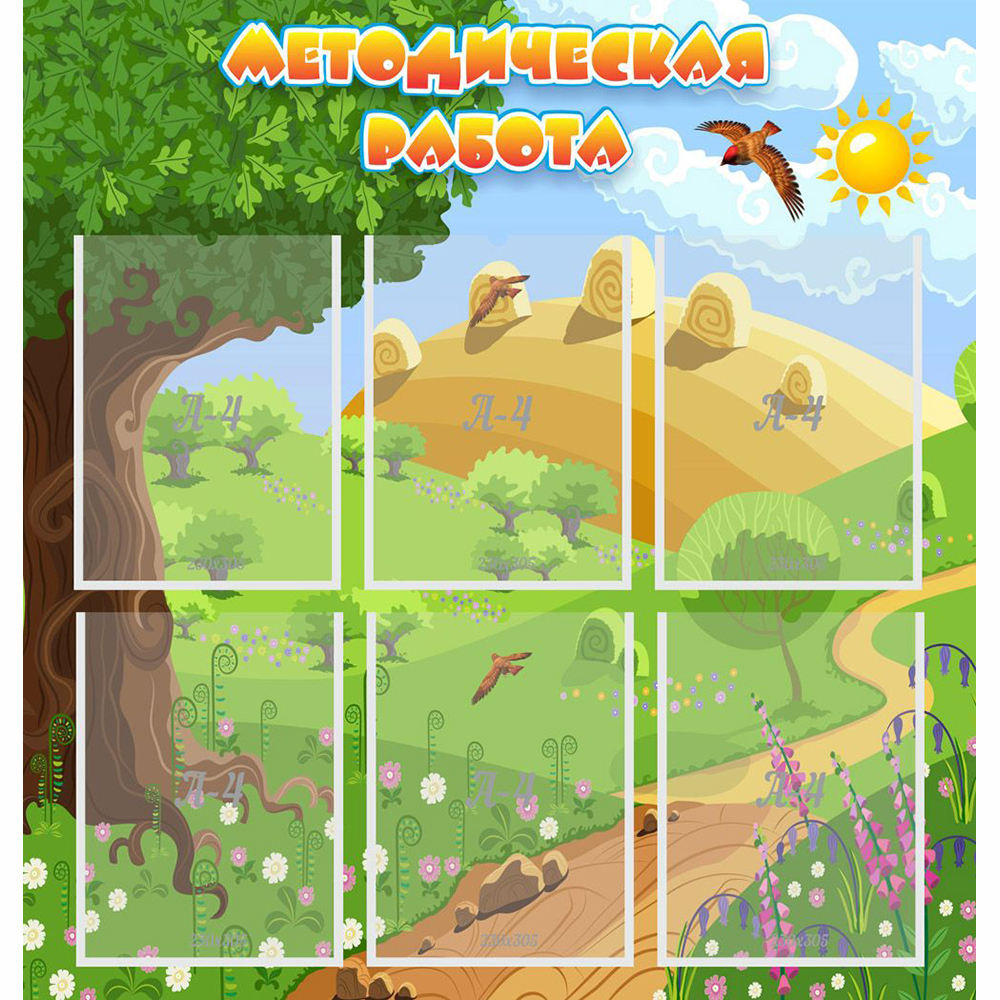 Это стенд информации для детского сада, который рассказывает детям и родителям важные сведения о методической работе учебного заведения. В акриловых карманах можно разместить документацию, расписание занятий, новости и многое другое. Яркий заголовок акцентирует внимание посетителей на этой информации.