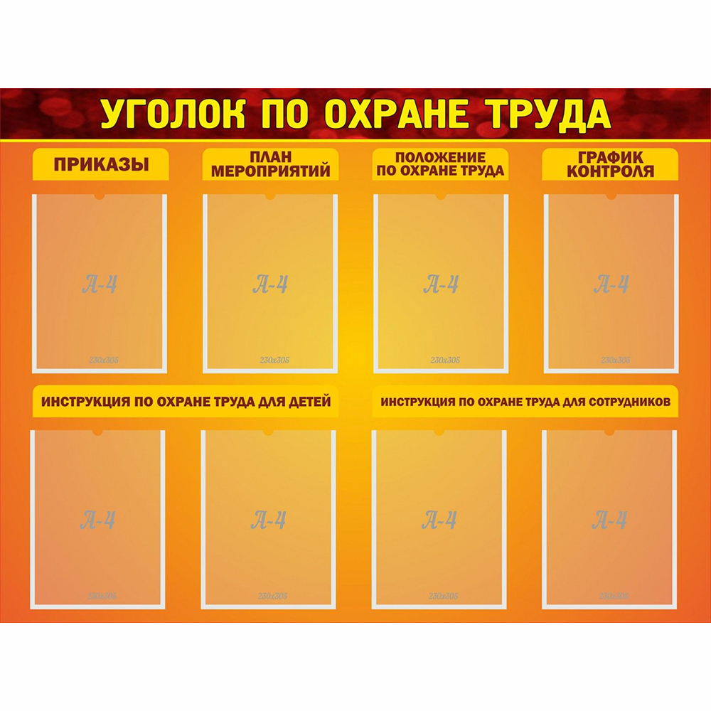 Нельзя представить себе ни одно детское заведение без информации об охране труда. Стенд имеет яркий фон, поэтому его будет видно издалека. Информация разбита на категории, а материал удобно разместится в кармашках. Это обеспечит доступность информации, сохранность ее внешнего вида, удобство в использовании. Материал, представленный на стенде, предполагает его использование администрацией, сотрудниками и детьми. Также, он будет полезен для ознакомления родителям. Имеет 6 категорий, в которые включены приказы, основные положения по охране труда, график контроля, план мероприятий, инструкции для детей и сотрудников.