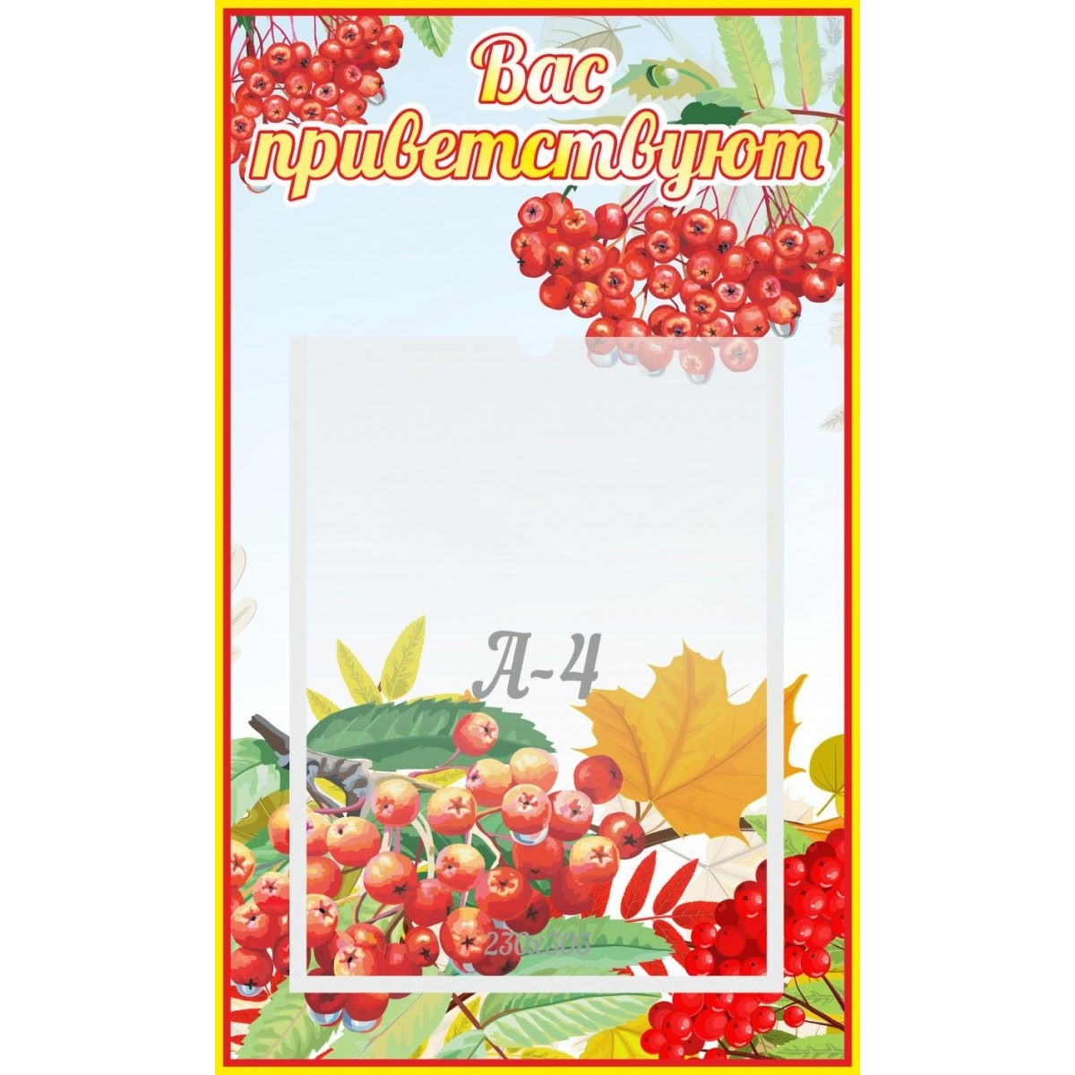Стенд украшен изображением осенних листьев и гроздей рябины. В удобный карман формата А4 можно поместить список группы малышей или любые другие информационные плакаты.