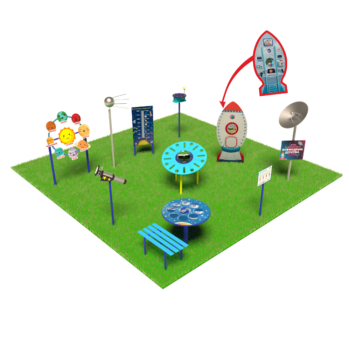 «Детская космическая станция» - это уличный комплекс, в состав которого входят красочные интерактивные стенды и макеты. С их помощью дети осваивают первые азы астрономии.