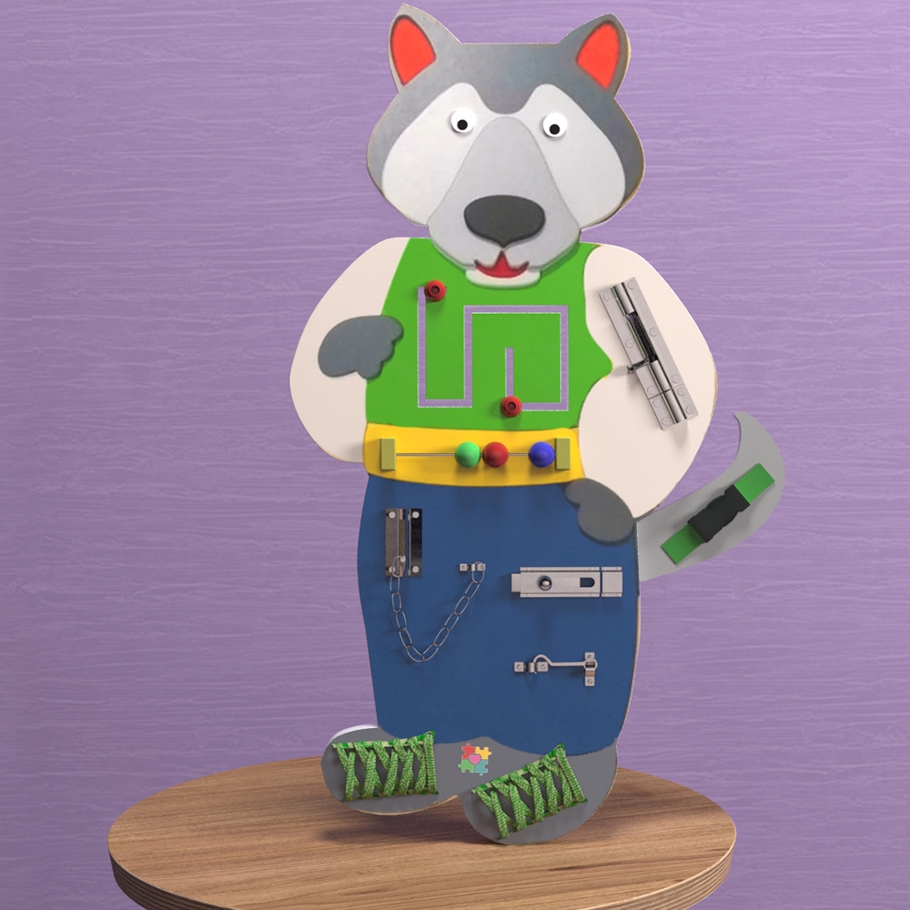 дидактическое приспособление с игровым уклоном с высокой игровой ценностью для детей от 1 года. Бизиборд «Волчок-серый бочок» - одна из моделей, которая крепится к стене. Основа изготовлена в виде фигуры сказочного Волка, на которой размещены разнообразные приспособления для детской игры. Все края закруглены и обработаны по специальной технологии, что гарантирует безопасность в использовании даже самыми маленькими детками.