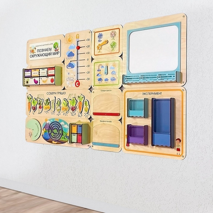 • Прочно закрепляются на стенах и не свалятся на детей, даже если они будут тянуть. Все материалы панелей безопасны для детей и сертифицированы. Малыши могут трогать, облизывать и грызть деревянные детали – их здоровью ничего не угрожает.