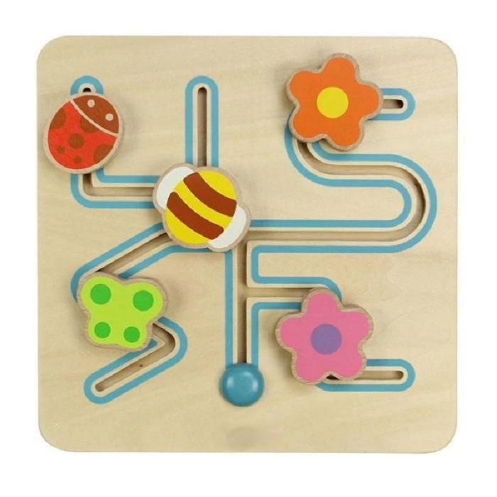 На панели расположен скользящий лабиринт, в котором зафиксированы бегунки в форме насекомых, выполнен из экологически чистого европейского бука. Подходит для тренировки мелкой моторики.