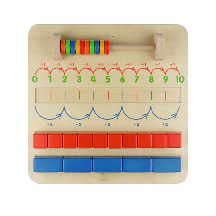 10 красочных бусин; 10 красных блоков - стоят на делении 1; и 5 синих блоков, стоят на делении 2.