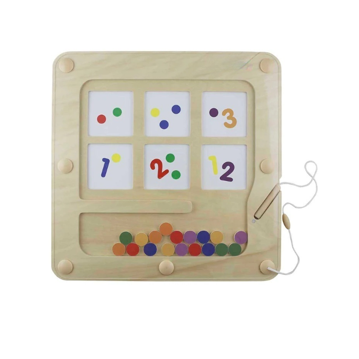 Панель выполнена из березовой фанеры, представлена в виде магнитного лабиринта. Используя магнитную ручку, необходимо разместить цветной шарик в соответствующее окошко: по цифре, цвету или количеству точек.