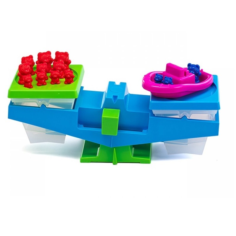 На две прозрачные чаши можно ставить груз в виде мишек. Для каждой чаши есть крышки, которые можно использовать, как платформы для груза.