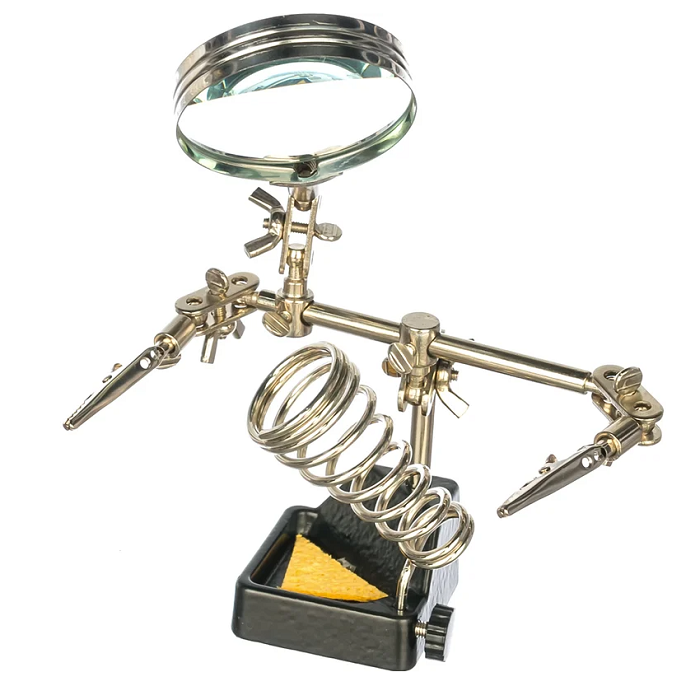 Держатель «третья рука» с лупой х2.5 служит главным образом при проведении паяльно-сборочных работ в электронике, ювелирном деле, сборке и ремонте для зажима мелких деталей в любом нужном положении, когда не хватает двух рук.