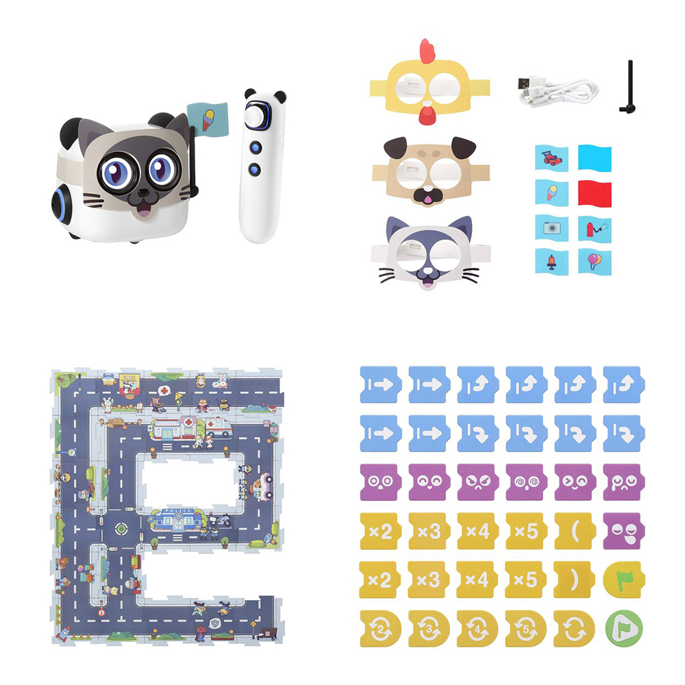 Набор состоит из робота, управляющей ручки, карты с кодами управления, игровой карты-поля, игровых элементов (флажков, карточек, масок и т/п). Управляющая ручка и робот оснащены аккумуляторами, которые заряжаются через интерфейс USB (5 Вольт). Кабель для зарядки входит в комплект поставки.
