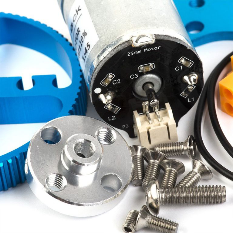 Набор содержит двигатель постоянного тока 25mm DC Motor, а также детали для крепежа и передачи крутящего момента.