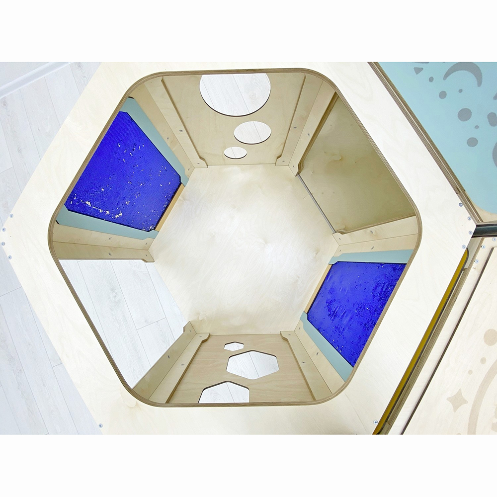 Внутри модули украшены тактильными панелями для развития сенсорной чувствительности, а снаружи – лазерной гравировкой и фигурными окошками. Они идеально стыкуются между собой и позволяют конструировать из них замки и лабиринты для маленьких непосед.