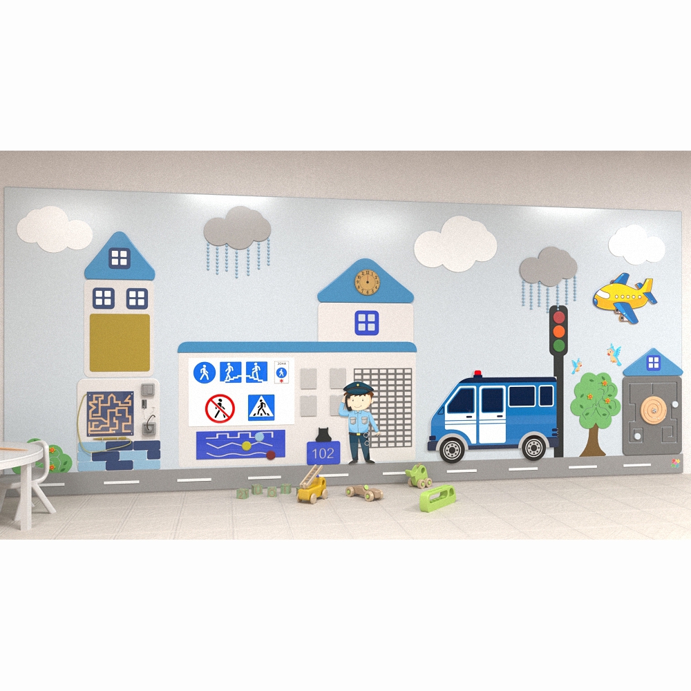 Настенная панель «Полиция» не нуждается в дополнениях и может выступать как самостоятельное оснащение игровой зоны в общественном учреждении (медицинской клинике, банке, кафе, частной компании) благодаря размерам и обилию разнообразных функций.
