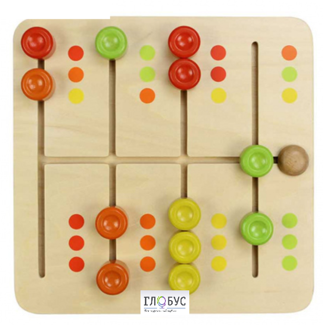 На панели расположен лабиринт с разноцветными колышками. Детям нужно будет подвинуть колышки подходящих цветов к нужным ячейкам.