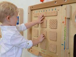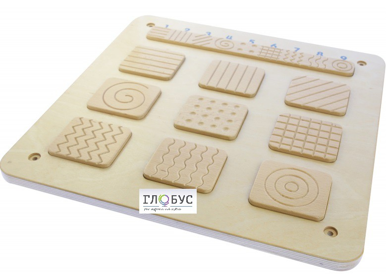 Настенная панель выполнена из березовой фанеры. На лицевой части в больших прямоугольных углублениях расположены 9 образцов деревянных плашек с различной текстурой поверхности для тренировки тактильных навыков.  В верхней части расположены схожие образцы текстурных поверхностей. Над деревянной планкой изображены цифры от 1 до 9. По углам панели размещены отверстия для крепления панели к стене.