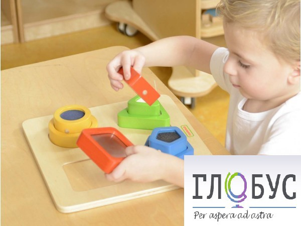 На лицевой части панели представлены 4 пары штабелируемых блоков с различными текстурами. Каждая пара имеет свою форму и цвет. Панель предназначена для развития тактильных и моторных навыков, логического мышления, а также для знакомства с формой и цветом.