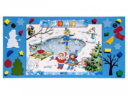 В комплекте со стендом поставляются карточки с изображениями зимней атрибутики, что позволяет проводить обучение в игровой форме. Дети выбирают изображение, которое, по их мнению, соответствует элементу на карточке, показанной воспитателем.